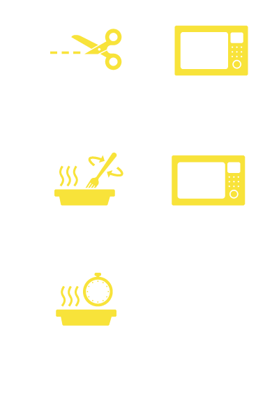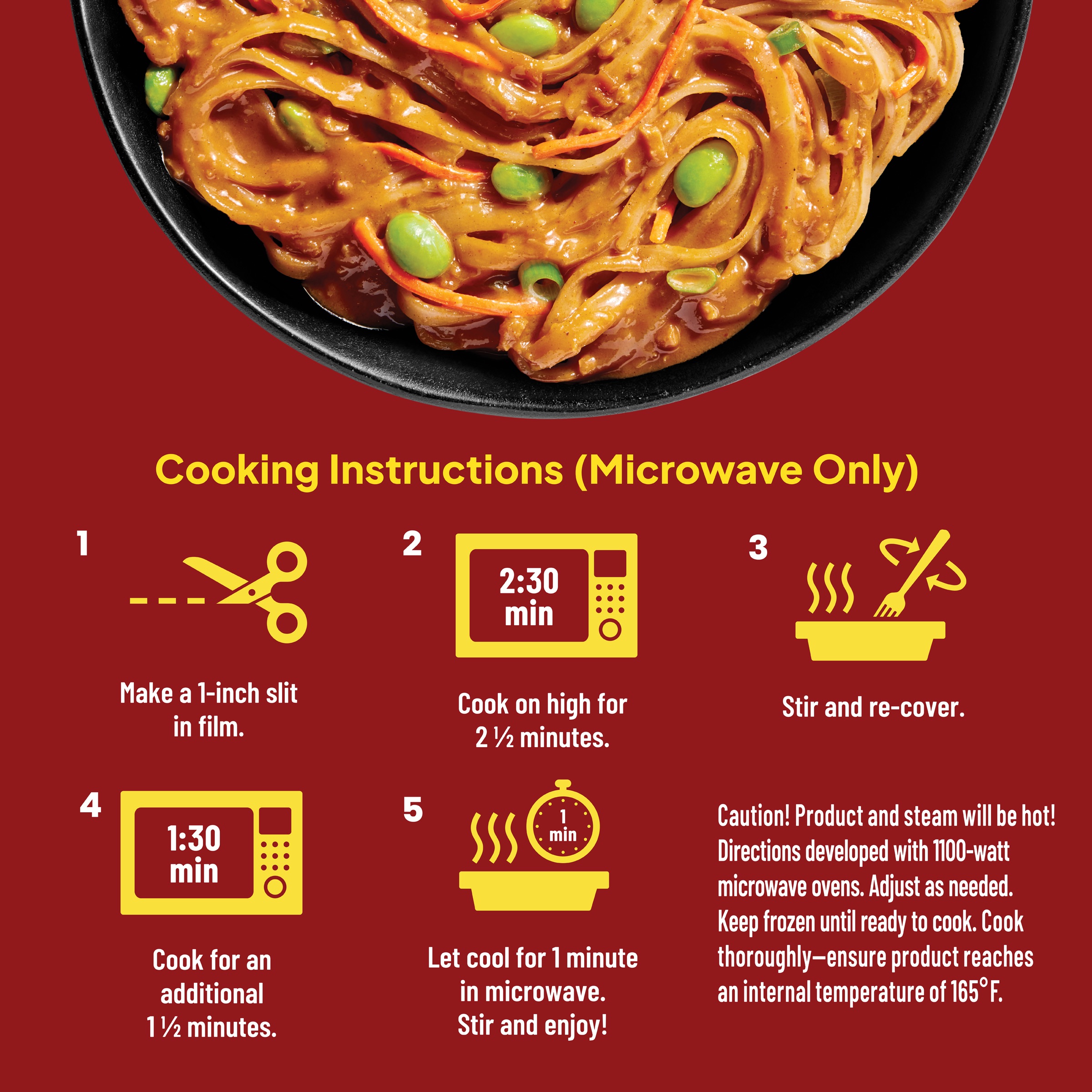 Caution! Product and steam will be hot! Directions developed with 1100-watt microwave ovens. Adjust as needed. Keep frozen until ready to cook. Cook thoroughly—ensure product reaches an internal temperature of 165°F.